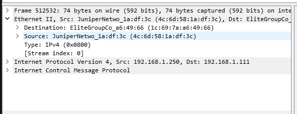 The MAC address of my workstation’s nic is 1C-69-7A-A6-49-66 and the MAC address of the Default Gateway Router’s nic is 4C-6D-58-1A-DF-3C.